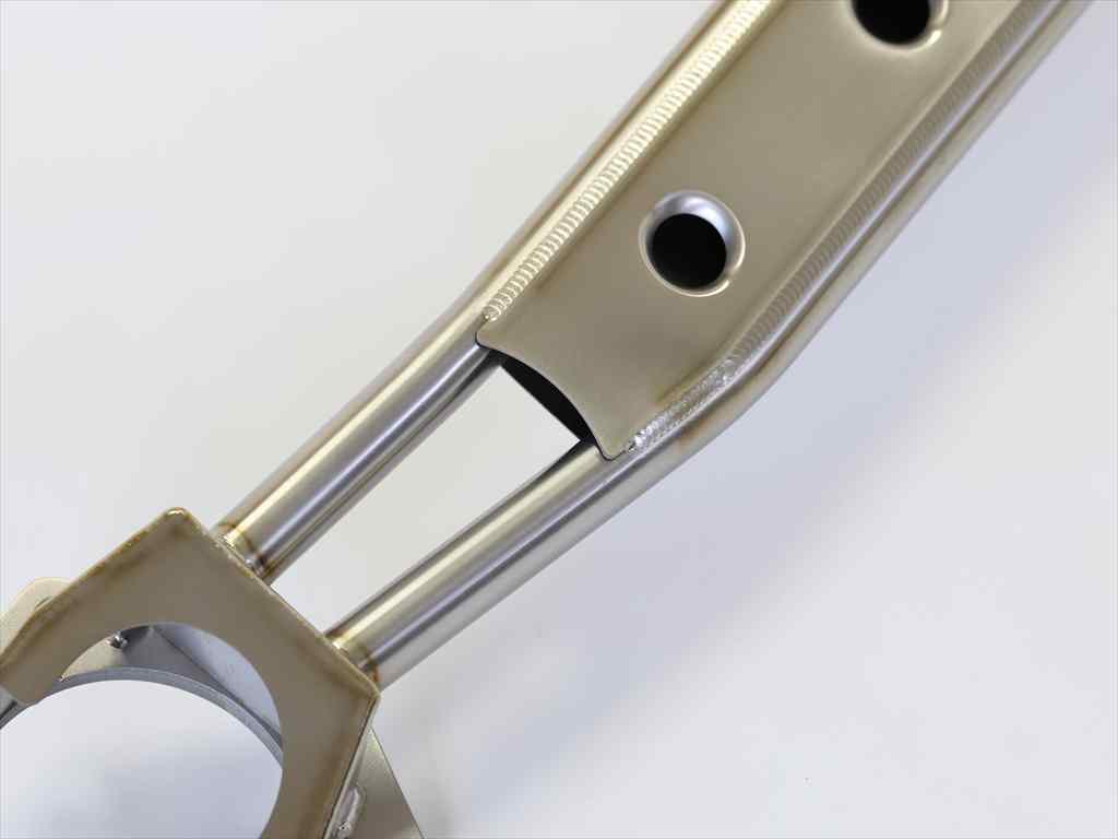 ブラケットとバー部分をねじ止めではなく、ボックス形状のブラケットを溶接して1本物のFL5専用設計にすることで、チタン素材の引張強度を極限まで生かす設計。
